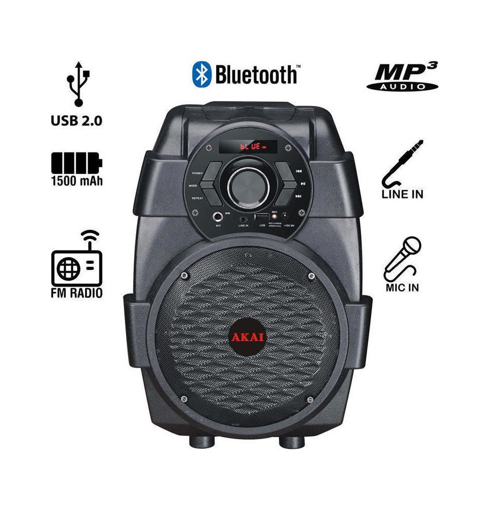 Ελαφρύ και φορητό ηχείο Bluetooth Akai ABTS-806, με ενσωματωμένη μπαταρία 1500mAh για αυτονομία. Ο δυνατός και καθαρός του ήχος με ισχύ 10W το καθιστά κατάλληλο για εσωτερικούς και εξωτερικούς χώρους.Διαθέτει ραδιόφωνο FM, υποδοχή για σύνδεση ενσύρματου μικροφώνου (λειτουργία karaoke), USB καθώς και υποδοχή 3,5mm jack για σύνδεση ακουστικών ή άλλων πηγών ήχου, όπως smartphone, laptop και tablet. Υποστηρίζει αναπαραγωγή αρχείων MP3, WMA και WAV και διαθέτει LED οθόνη. Στο πακέτο περιλαμβάνεται φορτιστής.